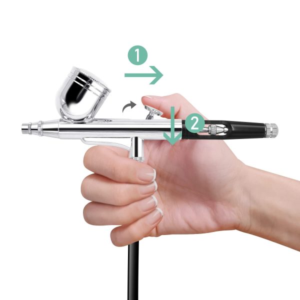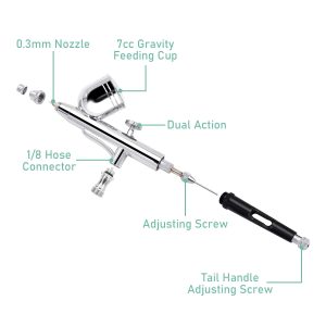 - DUAL-ACTION AIRBRUSH – Dual-Action Gravity Feed Air brush with a 0.3 mm Needle/Nozzle and a 7cc Gravity Feed Fluid Cup with lid for easy spraying fluid and easy cleaning. It can not only control the fluid by the end part of of the airbrush gun but also the pigment volume and air by the trigger on the airbrush pen. The air spray gun is really great and make wonderful color effect.