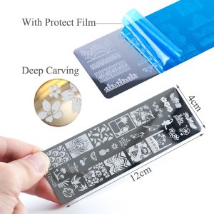 - Warm Tip – You need peel off blue protect film before using,use the jelly stamper to transfer image from the stainsteel nail plates then stamp on your nails quickly.(Please pay attention to the sharp edges of the stainless steel template so as not to scratch)