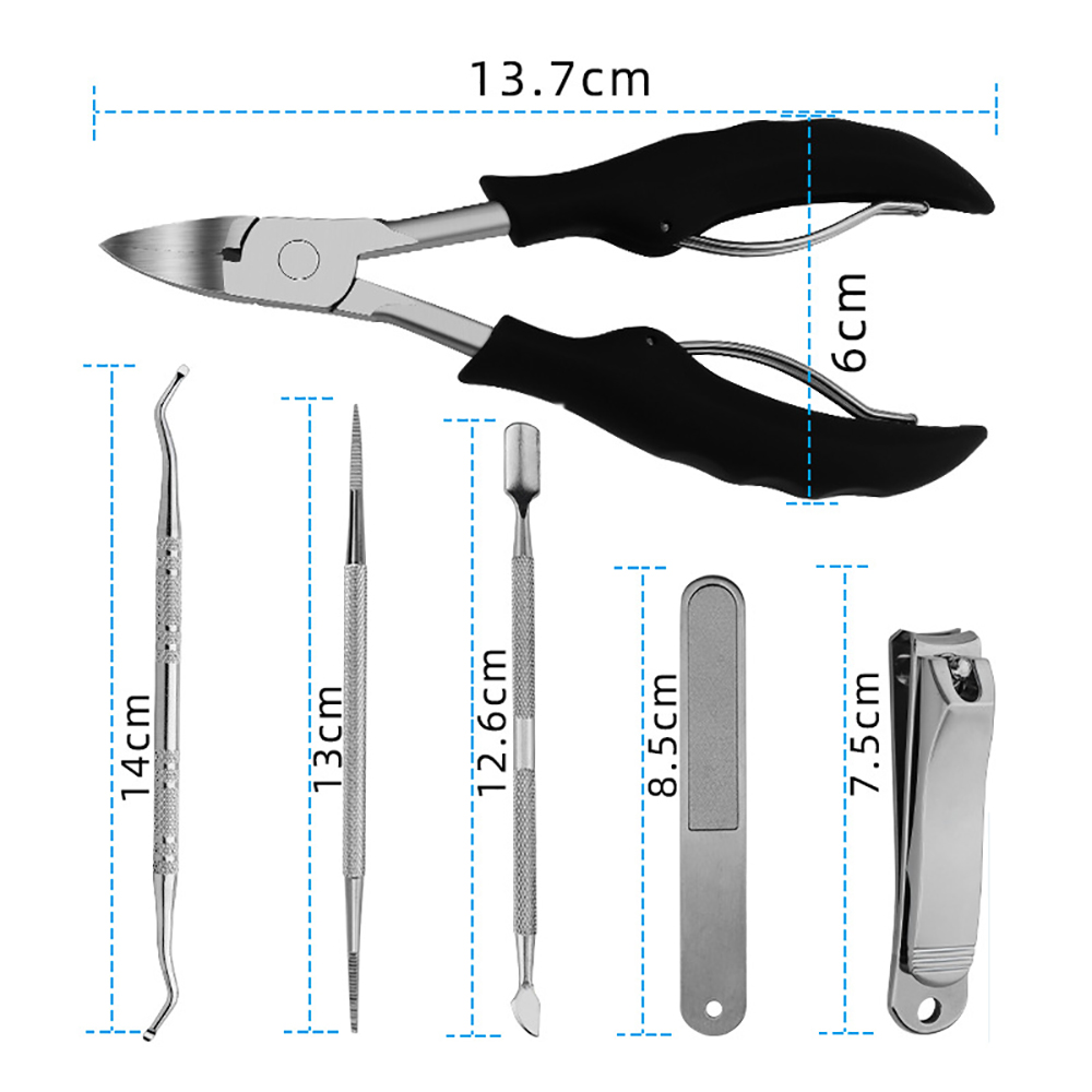 - Nail Clipper Set: 6-in-1 toenail trimmer set consists of 6 tools, 1× Wide Jaw Opening Nail Clipper, 1× Ingrown Toenail Clippers, 1× Nail File, 1× Nail Cuticle Pusher, 1× Ingrown nail File, 1× Toenail Lifter. Meet your different nail trimmer needs, keeping your feet healthy without pain and nail fungus.
